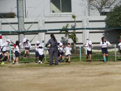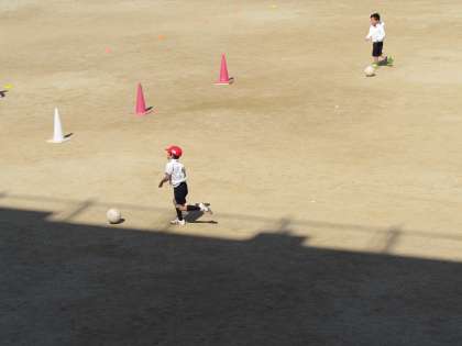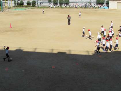 1年生の学習の様子です。1年生が運動場で、体育をしています。1組はボールを蹴る運動を(画像上・中)、2組は鉄棒運動に取り組んでいます(画像下)。