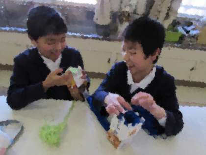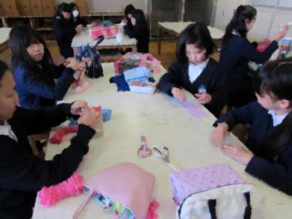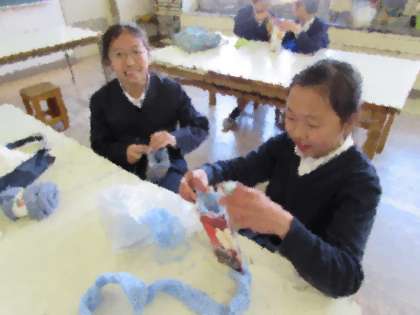 手作りクラブでは、毛糸を使った編み物に取り組んでいます。牛乳パックを使ってマフラーを編む子や、棒編みにチャレンジしている子がいます。