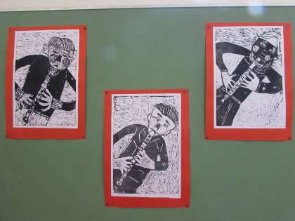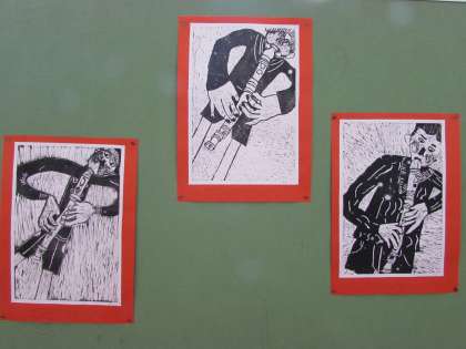 4年生になって、初めて木版画に取り組みました。彫刻刀で、細かい部分にも気を付け、彫りました。顔の表情や、指の動きなど、なかなかの出来栄えです。今回の題材は、「リコーダーを吹く自分」です。