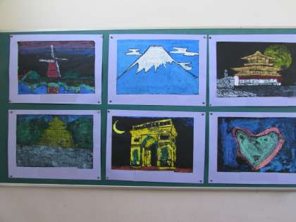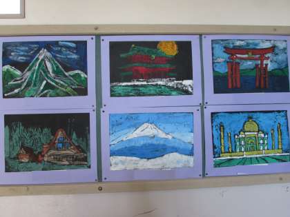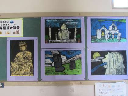 5年生の版画の作品をご紹介します。5年生は、一版多色刷りで、世界遺産を表現しています。