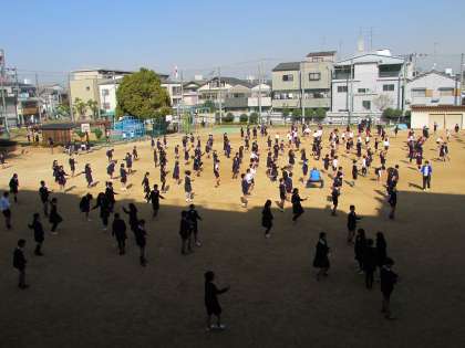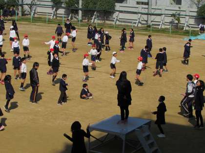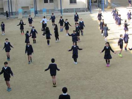 なわとび週間5日目、高学年の様子です。音楽に合わせ、準備運動⇒跳び方(1)⇒跳び方(2)と、活動しています。