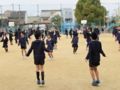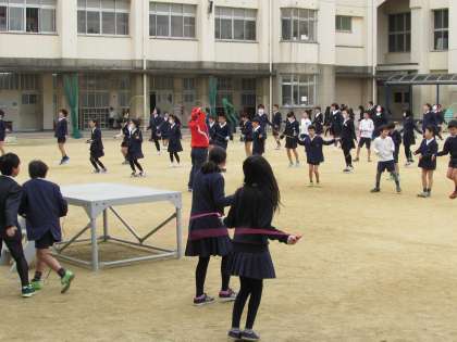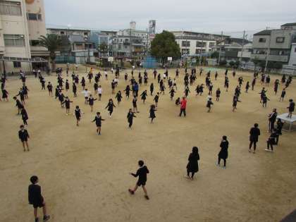 なわとび週間の7日目、高学年の日です。音楽に合わせて、準備運動をし、様々な跳び方に取り組んでいます。