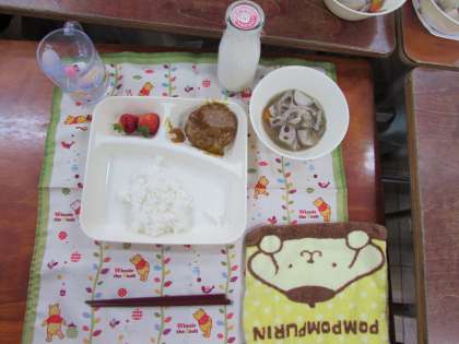それに、子どもたちの大好きなハンバーグをカレー味にし、いちごを組み合わせて華やかな献立になりました。