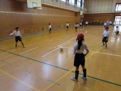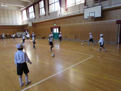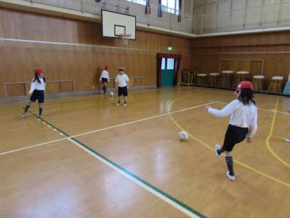 2年生が体育館で、体育の学習をしています。サッカー型ゲームの練習です。3人でパスを回す練習をしています。