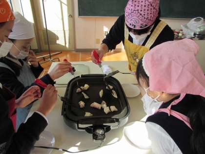 料理クラブでは、餃子の皮でチョコやマシュマロを包んで、ホットプレートで焼きました。焼きあがった「チョコ餃子」は、とてもおいしかったです。