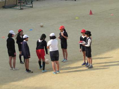 1組の体育は、サッカーです。チームで話し合って、練習の方法も考えました。