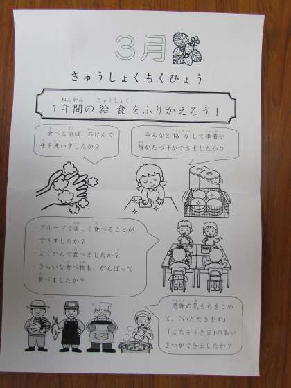 3月1日(火) 3月の給食目標です。今月の目標は、「1年間の給食をふりかえろう」です。