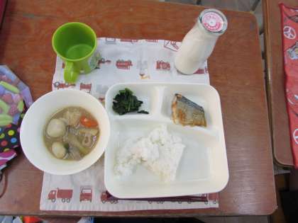 本日の給食の献立をご紹介します。本日の献立は、ご飯、さばのおろしじょうゆかけ、厚揚げと里芋の味噌煮、ほうれんそうのお浸し、牛乳でした。