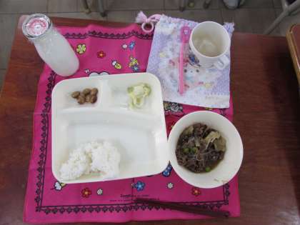 本日の給食の献立をご紹介します。本日の献立は、ご飯、肉じゃが、白菜の甘酢漬け、とら豆の煮物、牛乳でした。