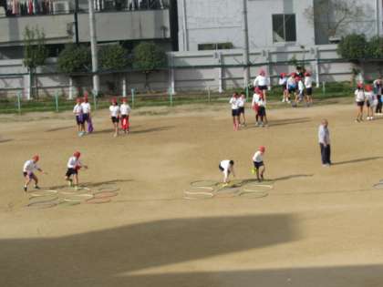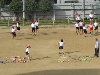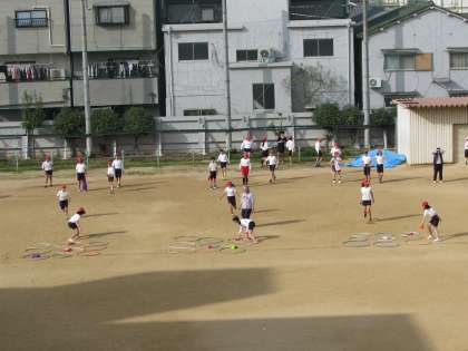 6年生の体育の学習の様子をご紹介します。地面に9つ、輪を置き、○×ゲームを行いました。順番に赤白帽を置き、縦・横・斜めに3つ並べたチームが勝ちです。