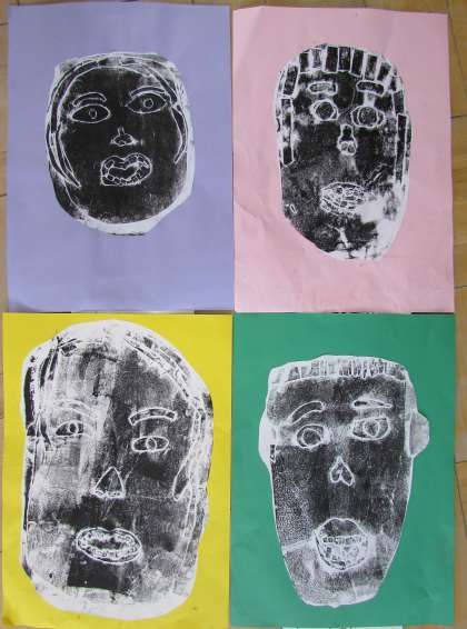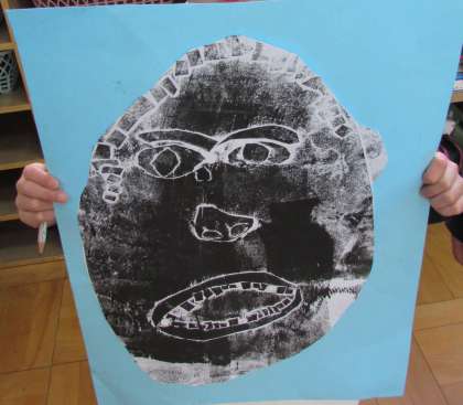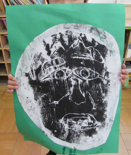 1年生が図画工作の学習で、紙版画に取り組みました。自分の顔を、大きく表現しました。紙を貼って、重ねることで表現できるということを、楽しみました。