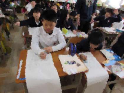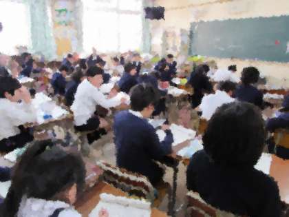 3年生の学習の様子をご紹介します。1組は、社会科のテストです。頑張って、解いています。