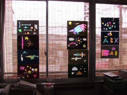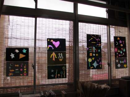 2年生の作品「光のプレゼント」です。作品を窓に貼ると、光が透けてステンドグラスのようです。子どもたちも友達の作品を見て、「すごい。」「きれい。」と、感動しています。