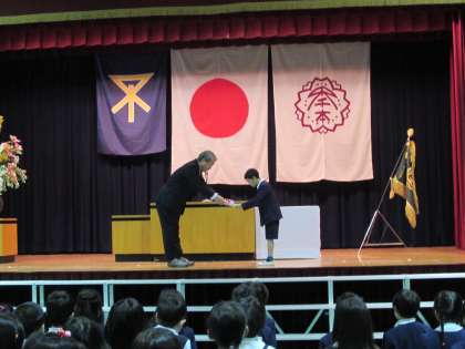 本日は平成27年度の修了式でした。初めに、5年生の代表児童に、学校長から修了証が渡されました。学校長からの話では、春休み、毎日朝晩、歯磨きをしましょうとの話がありました。