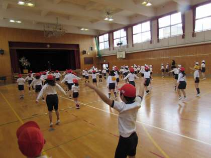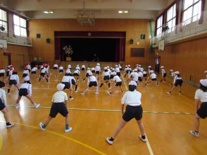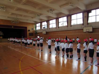 4年生の学習の様子です。今日は、体育館に集まり、皆で集合や整列、体操の練習をしました。