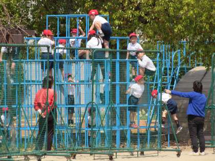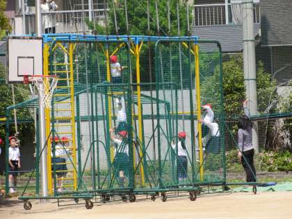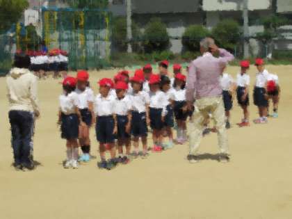 1年生の学習の様子をご紹介します。今日は、初めての体育です。皆で運動場に出たのも、初めてです。今日は、整列の仕方を学習し、運動場にある遊具を使った運動も行いました。