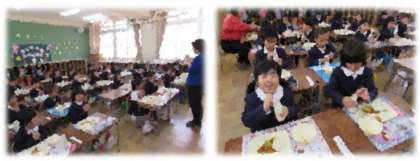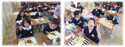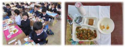 本日の給食の献立をご紹介します。本日の献立は、カツカレーライス、フルーツ白玉、ミニフィッシュ、牛乳でした。本日の給食は、1年生の入学お祝い献立でした。