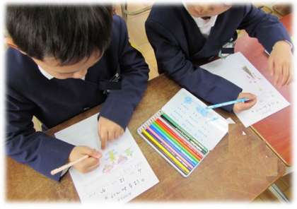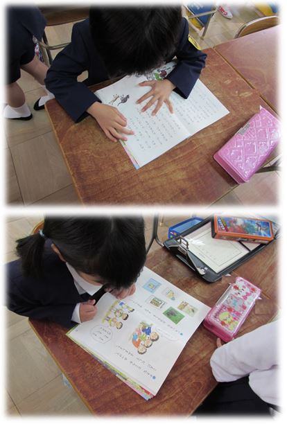 1年生たちも元気に登校してきました。朝の準備が終わった子たちが、生活科の観察カードをかいたり、国語の教科書を読んだりしています。