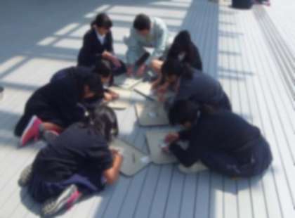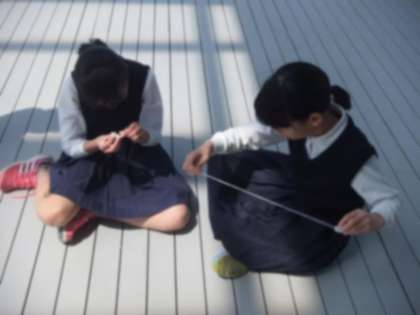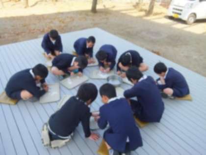 午前中は、まず弥生学習館でまが玉づくりに取り組みました。それぞれが紙やすりで原石をけずり、その後、耐水性の目の細かな紙やすりで思い思いのまが玉にみがきあげていきました。