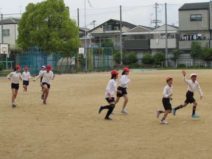 6年生の学習の様子をご紹介します。体育では、初めにウォーミングアップとしてトラックを走りました。