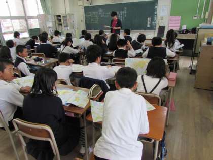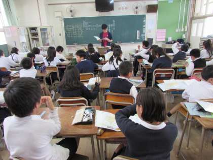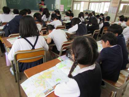 5年2組は、社会科の学習です。地図帳を見ながら、経度と緯度について学習しています。