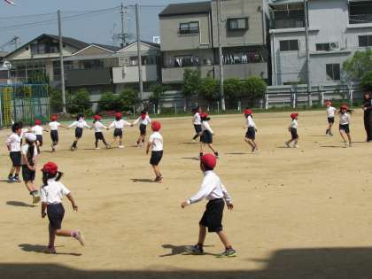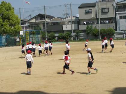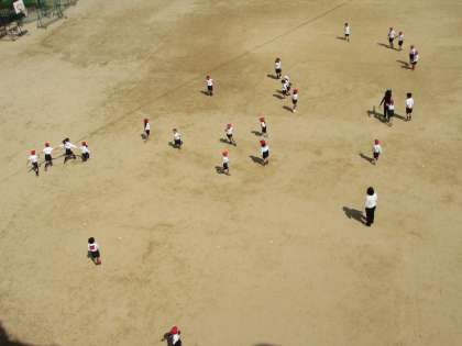 2年生の学習の様子をご紹介します。体育を運動場で行い、元気いっぱい体を動かしています。画像は、「増えおに」をしているところです。