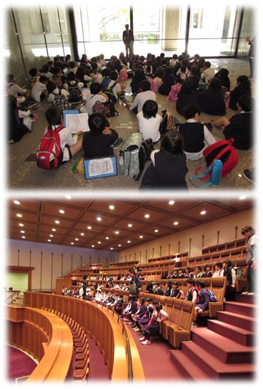 本日、3年生は春の遠足で、市役所見学に行きました。市役所では、市会議場を見学し、市会の仕組みについての説明を受けました。そして、1階に下りて、ロビーでの見学を行いました。