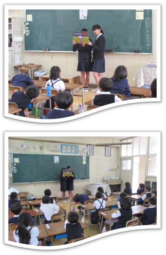 金曜日は、第1・第3週は保健委員会による清潔検査、第2・第4・第5週は図書委員会による紙芝居(1・2年生向け)となっています。今日は、図書委員会の子どもたちが1年生・2年生の教室に行って、紙芝居を読みました。1年生の子どもたちも、静かに、集中して聞いています。