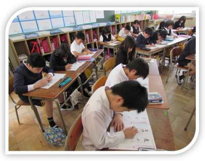 4年生の国語の学習の様子をご紹介します。国語で、硬筆書写の学習をしています。一字ずつ、一画ずつ確認をしながら、ていねいに書いていきました。