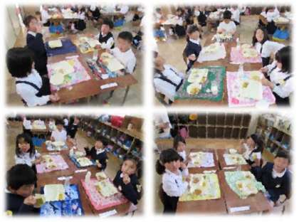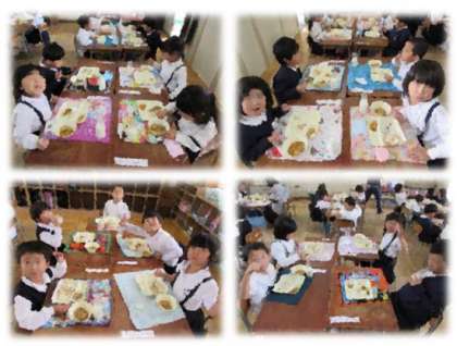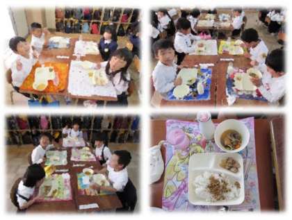 本日の給食の献立をご紹介します。本日の献立は、ご飯、焼き鳥、豚肉と厚揚げの煮物、紅鮭そぼろ、牛乳でした。