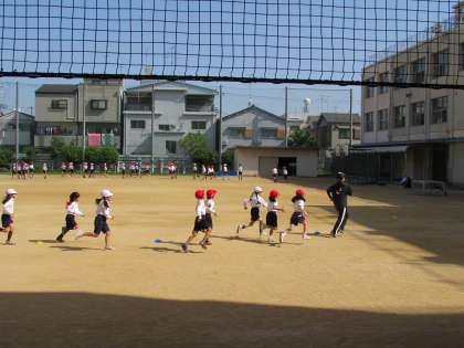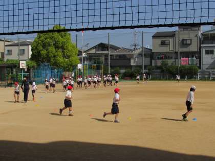 3年生の学習の様子をご紹介します。運動場で、体育の学習です。準備運動として、トラックを走っています。