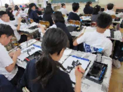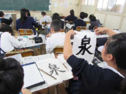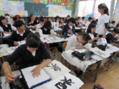 6年生の学習の様子をご紹介します。6年生が毛筆書写で「泉」という字を書いています。一画ずつ、ていねいに書いていきました。