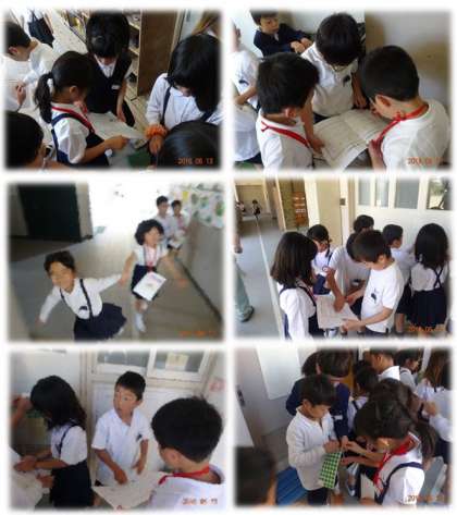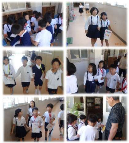 本日の2時間目、1年生は校内探検をしました。2年生に連れられ、学校内を歩いて、どこにどんな部屋や施設があるかを確かめていきました。1年生は広い校舎内を歩き、たくさんの部屋があることに驚いていました。1年生の手を引き、校内を説明して歩く2年生が、とても頼もしく思えました。
