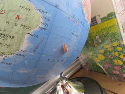 3年生は理科の学習で、モンシロチョウの幼虫の観察をしています。今日、アオムシを入れてあった容器を見てみると、アオムシがいなくなっています。どこへいったのだろう、とさがしてみると、容器の横に置いてある地球儀の上で、さなぎになっていました。大西洋のど真ん中で、チョウになろうとしています。