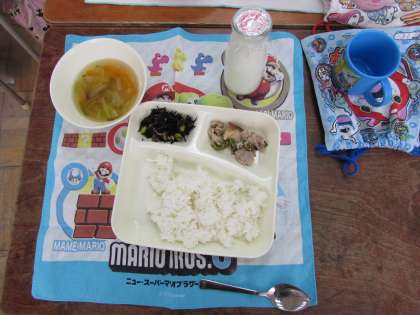 本日の給食献立をご紹介します。本日の献立は、ご飯、豚肉のごまだれ焼き、五目汁、ひじきの炒め煮、牛乳でした。