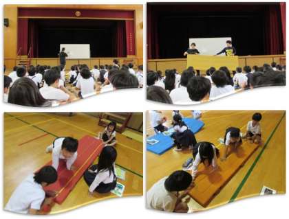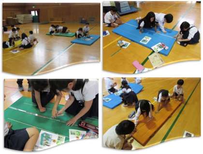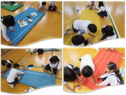 3年生の学習の様子をご紹介します。今日は、1mより長い長さを測る学習をしました。体育館に行き、マットの長さを測るためには、どのようにしたらいいだろうと考えました。自分たちの持っている定規や、教室にある1m定規よりも、巻き尺を使う方が便利であることに気づき、巻き尺を使って班ごとに測っていきました。