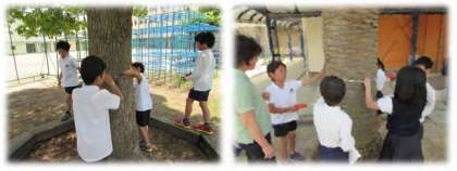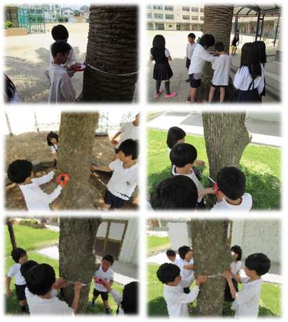 3年生の学習の様子をご紹介します。3年生の算数の学習は、「長さ」です。巻き尺を使って、定規では測れないところを測っていきました。運動場に出て、木の幹の周りの長さを測っています。