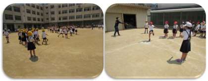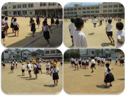 千本小学校では、今年度も学期に1回、子どもたちの体力作りを目的としてなわとび週間を設けます。1学期は、大なわを使ってのなわとびです。2時間目の後、各クラス2本ずつの縄を使って、運動場で大なわに取り組みました。低学年には、体育委員が縄を持って、回してあげていました。