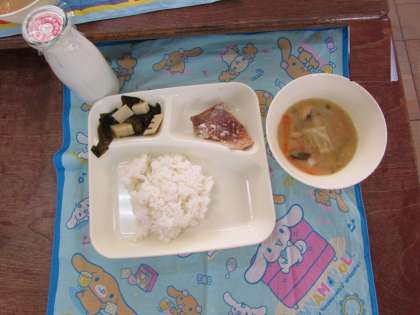 本日の給食の献立をご紹介します。本日の献立は、ご飯、あかうおのしょうゆだれかけ、みそ汁、わかたけ煮、牛乳でした。