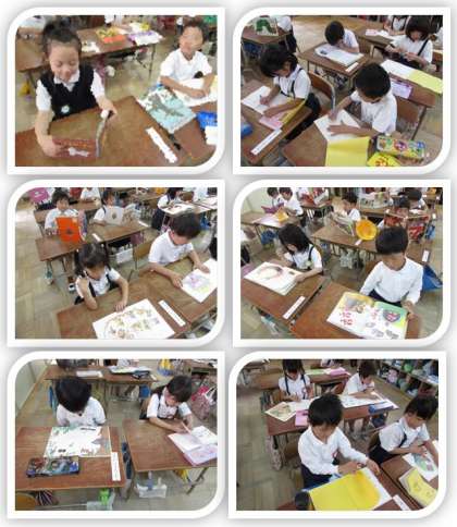 画像は、1年生の読書タイムの様子です。読んだ本の題名を、読書の記録に書いています。