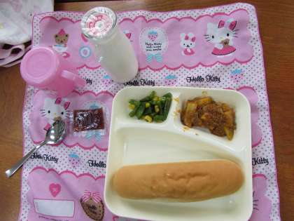 本日の献立は、コッペパン、いちごジャム、じゃがいものミートグラタン、スープ煮、さんどまめのソテー、牛乳でした。