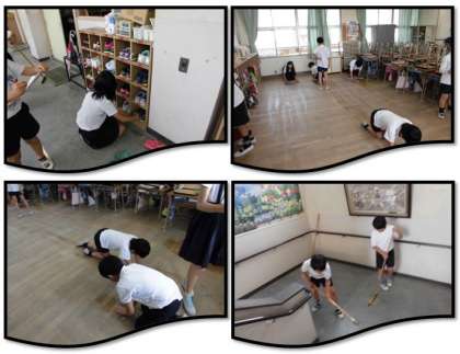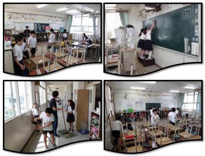 給食が終わると、全校一斉清掃です。5年生の子どもたちも、力を合わせて、自分たちの分担場所をていねいに掃除しています。