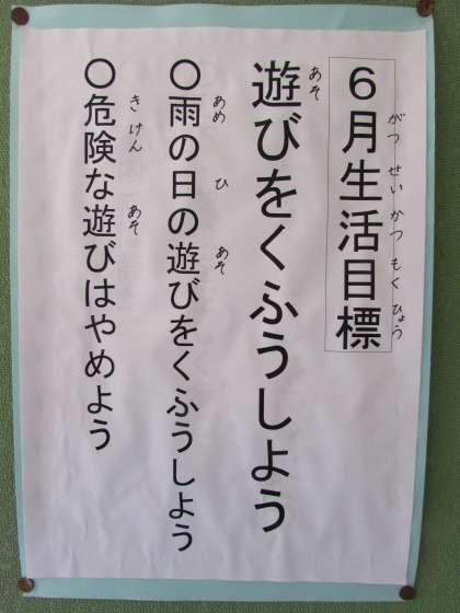 6月の生活のめあてです。6月のめあては「遊びをくふうしよう」です。具体目標は、