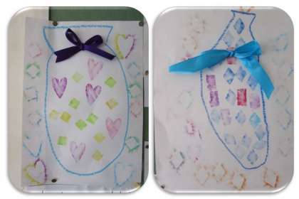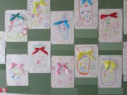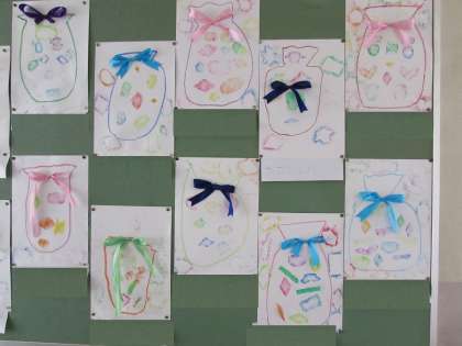 1年生の作品をご紹介します。図画工作の作品「キャンディーボックス」です。いろいろな形に切り抜いた画用紙を用意しました。切り抜いた穴や、切り抜いた画用紙の縁にパスをつけ、指でこすることで、かすれを使い、表現しました。きれいなきらきら輝くキャンディーが、いっぱいです。