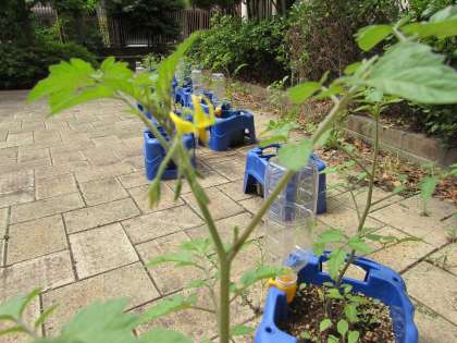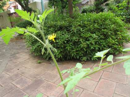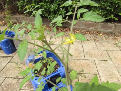 2年生が育てているミニトマトが、すくすくと大きくなっています。今日、見てみると、黄色い花が咲いているものがいくつかありました。