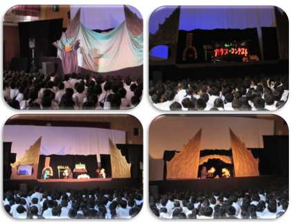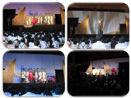 本日の3・4時間目、講堂で劇鑑賞会を行いました。人形劇団京芸による「ウォートンとカラスのコンテスト」という人形劇です。講堂の前半分ほどを使って、迫力のある劇でした。笑いあり、びっくりもあり、最後には感動もあり、とても楽しい劇鑑賞になりました。