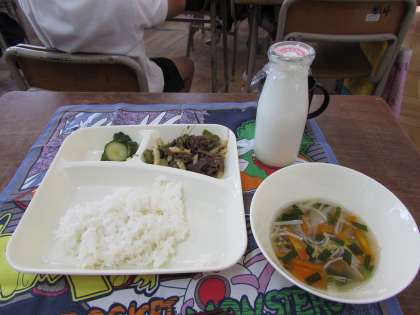 本日の給食の献立をご紹介します。本日の献立は、ご飯、チンジャオニューロウスー、ハムと野菜の中華スープ、きゅうりの辛味漬け、牛乳でした。