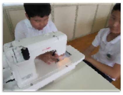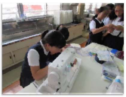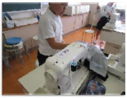 6年生の学習の様子です。家庭科室で、エプロンを作っています。ミシンを使って、ていねいに取り組んでいます。