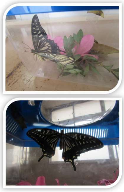 3年生が飼育・観察していたアゲハが2匹、羽化しました。大きな羽をもつ、立派なアゲハです。子どもたちが観察をした後、窓から外に逃がしてあげました。