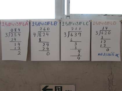 4年生は、算数で、わり算の筆算の仕方を学習しています。4年生の教室前の廊下には、画像のようなカードが貼られています。どの計算も、どこかに間違いがあるようです。どこが間違っているか、わかるかな。